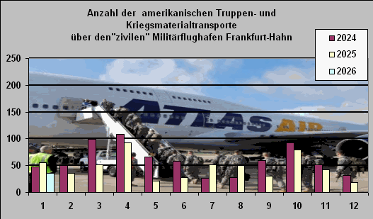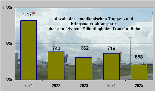 Seit Anfang 2005 werden/wurden US-Truppen und Kriegsmaterial mit sogeannten "zivilen" Militärflügen über den "zivilen" Kriegsflughafen Hahn im Hunsrück im Rahmen des Air Mobility Command in den Irak-Krieg, die Golfregion, nach Afghanistan und in weitere amerikanische Interessengebiete mit Rohstoffvorkommen oder wichtiger strategischer Lage transportiert. Im Zuge des Ukraine-Krieges von 2021 bis 2023 im großen Stil auch nach Polen.