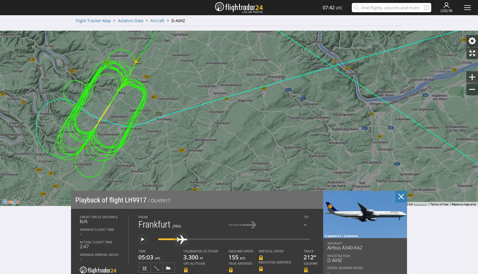 Am Mittwoch, den 26.07.2023 fand erneut Pilotentraining der Lufthansa am Flughafen Frankfurt-Hahn statt. Um Punkt 07.00 Uhr flog ein Airbus A 340-642 der Lufthansa mit dem Kennzeichen D-AIHZ vom Flughafen Frankfurt am Main in den Luftraum Hahn ein, um anschließend bis ca. 09:10 ca. 20 Runden (8x Naheseite, 12x Moselseite) um den Flugplatz Frankfurt bei Hahn zu drehen. Der Flug wurde mit den Flugnummern LH 9916 und LH 9917 durchgeführt.