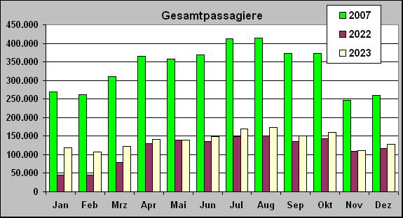 In den 1.673.219 Passagieren des Zeitraums Januar bis Dezember 2023 sind 35.653 Transitpassagiere (einfach gezählt) enthalten. Im Vergleichszeitraum des Vorjahres waren es 29.158 |